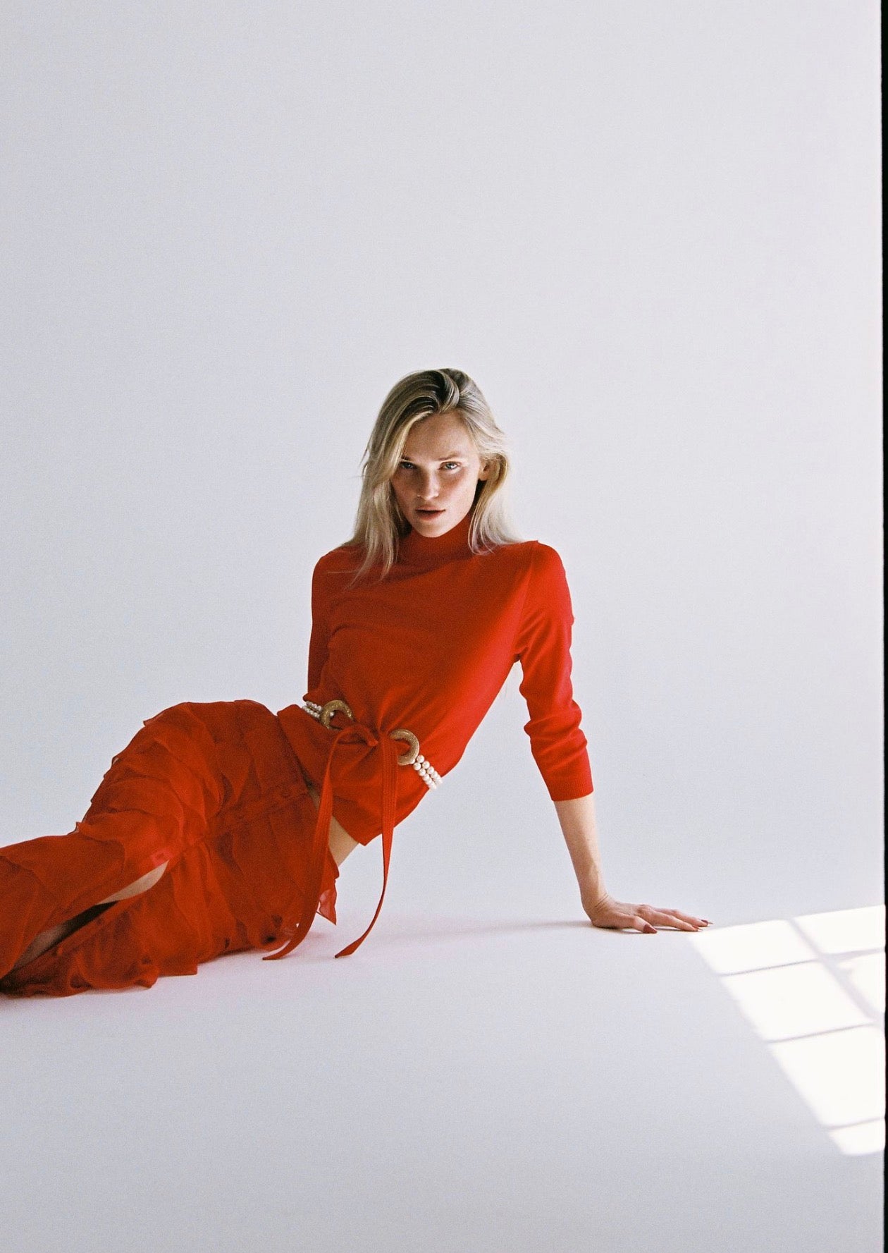 Valentino S/S 2005 runway finale look. Silk skirt that buttons at the front and lone sleeve turtleneck top with pearl belt.
